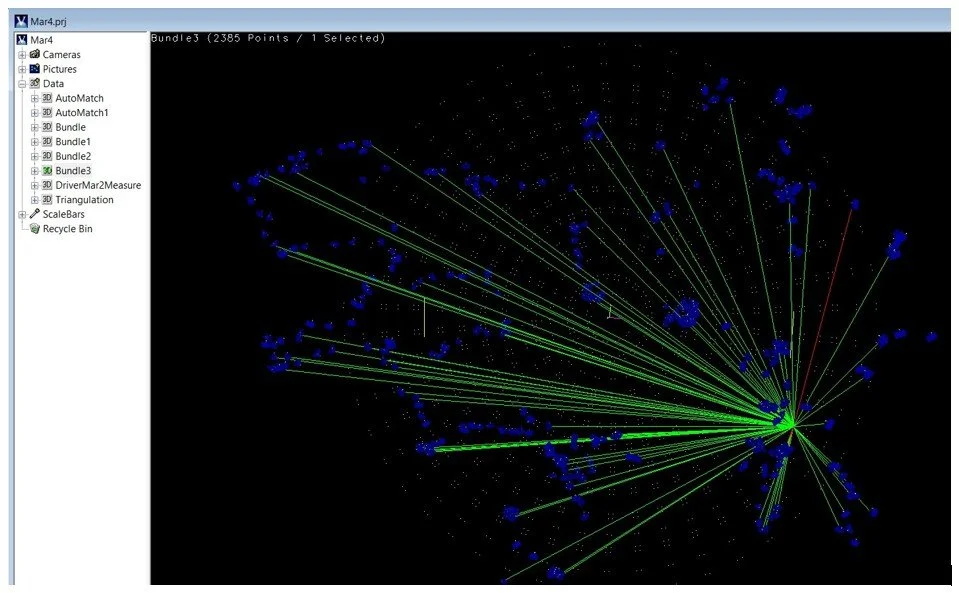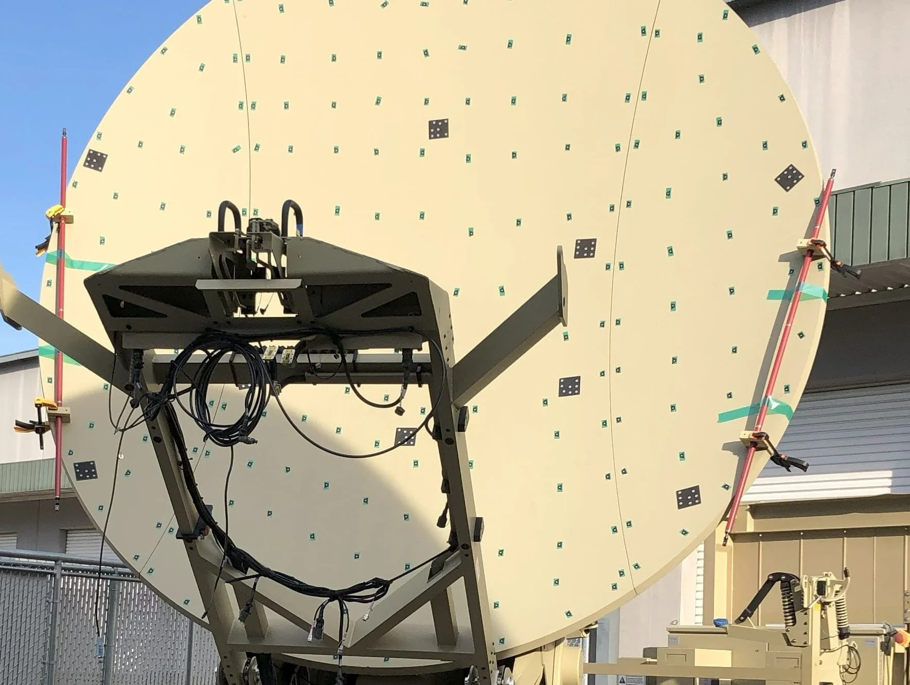 Question: How does Photogrammetry Work? Answer: Reflective targets are placed on item to be measured. Typically, these reflective targets are 0.500-inches in diameter. In addition, unique patterns of reflective targes on a 5-inch square plastic backer plate are also placed on the item. These plastic backers are called codes. At least two scale bars with reflective targets are also placed on the item to be measured. These scale bars have precise lengths associated with each. A series of photographs are taken with a specialized camera. For larger items such as a 13-Meter diameter satellite, up to 150 digital photographs are taken at various positions covering the entire projection of the item to be measured. The digital photographs are processed through a specialized software that uses the coded targets to mosaic all the photographs together. The scale bars scale the resulting spatial data represented by the reflective targets into three-dimensional coordinates. Additional downstream processing of the data inserts coordinate systems and also has the capability for fitting into various geometric primitives such as planes, circles, cylinders, paraboloids, and even CAD data.